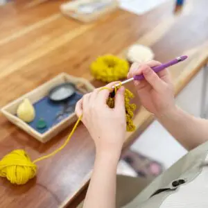 ハンドメイドは、ほとんどしたことがないという、Sさん。初めてのかぎ針編みということで、《シュシュ》にチャレンジです。飲み込みが早く、とても器用な方でした。最後の糸処理で、一生懸命すぎたようで、まさかのゴムが伸びない《シュシュ》になってしまいましたが、ふわふわの編み地で可愛く仕上がりました。お疲れ様でした。